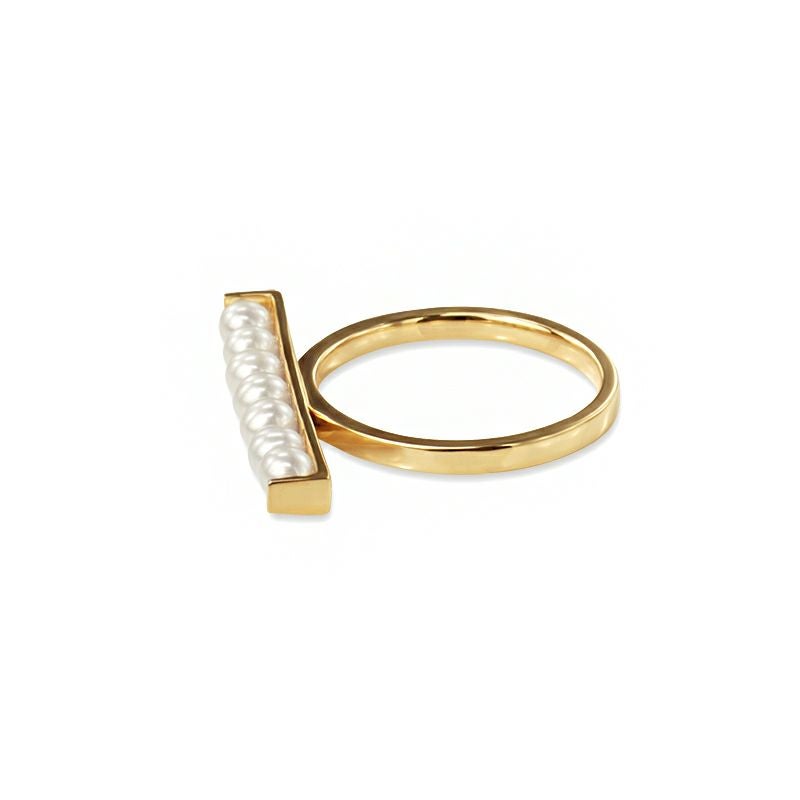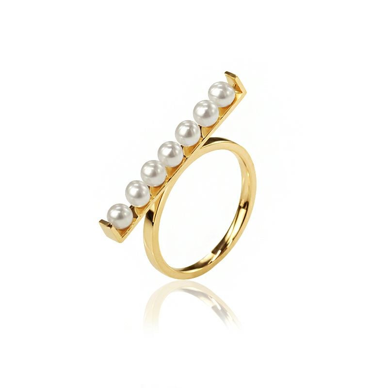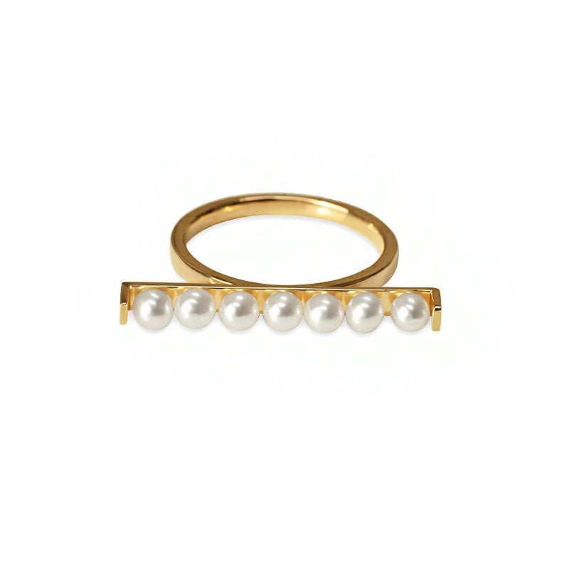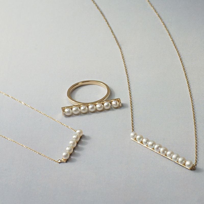 スクエアバーにパールが7粒並んだボリュームある個性的なデザインが視線を惹きます。