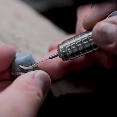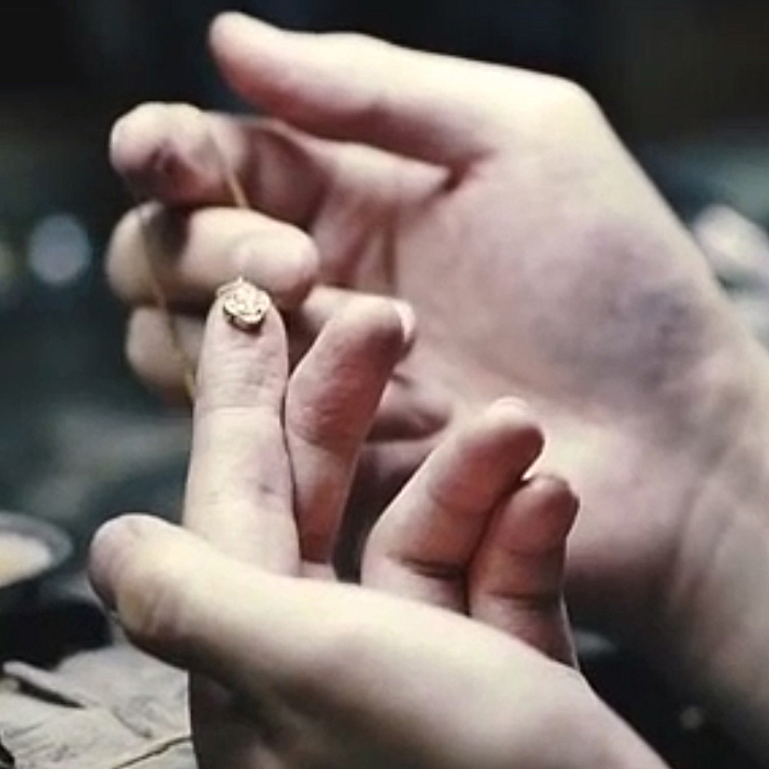 焼きあげられたものを、普段私たちが手にする状態になるまで洗い、何度もヤスリやブラシをかけて磨き上げていきます。ジュエリーの主役となる石を留める作業。製品を傷つけないように細心の注意を払い、コンマ1ミリの隙間もないよう、しっかり留めていきます。