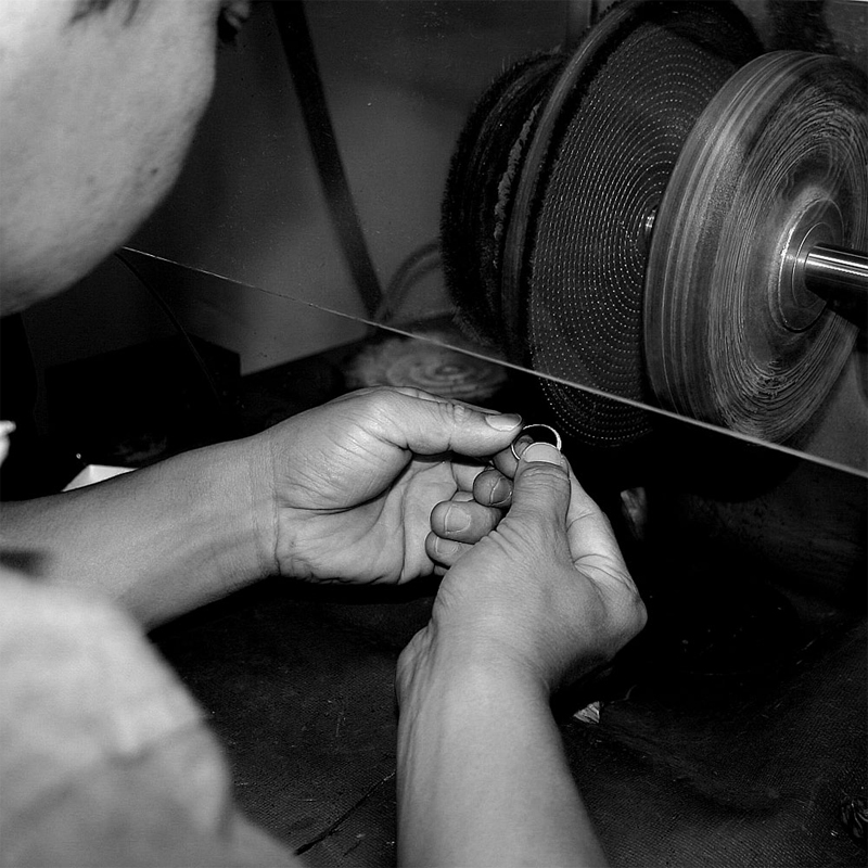 機械で研磨しただけでは、まだ製品の表面やリングの内側がざらついているので、一つ一つの製品を手作業で細部までよく見ながら磨きます。